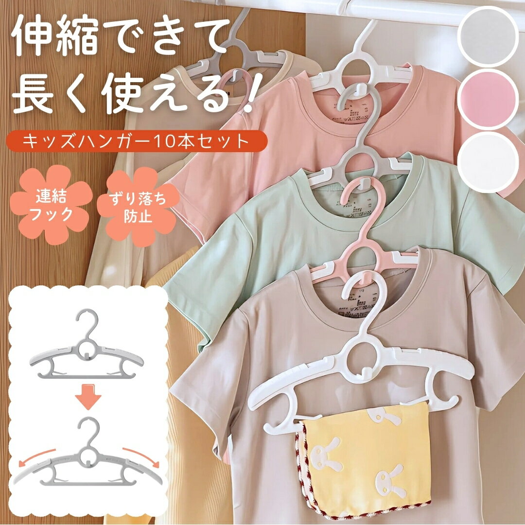 【楽天1位】 子供用ハンガー 伸縮式 10本セット ベビーハンガー キッズハンガー 子供服ハンガー ハンガー 子供用 子供 ハンガー 成長しても使える すべらない 伸縮式 滑り止め 連結 多機能 省スペース 連結フック ズボン スカート 送料無料 レビュー特典