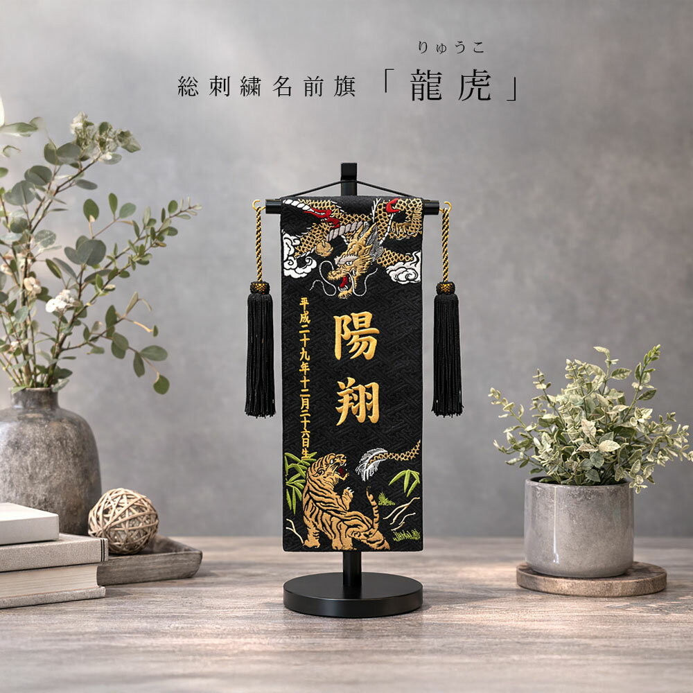 名前旗 名入れ旗 五月人形 刺繍 総刺繍名前旗 龍虎 木製スタンドセット